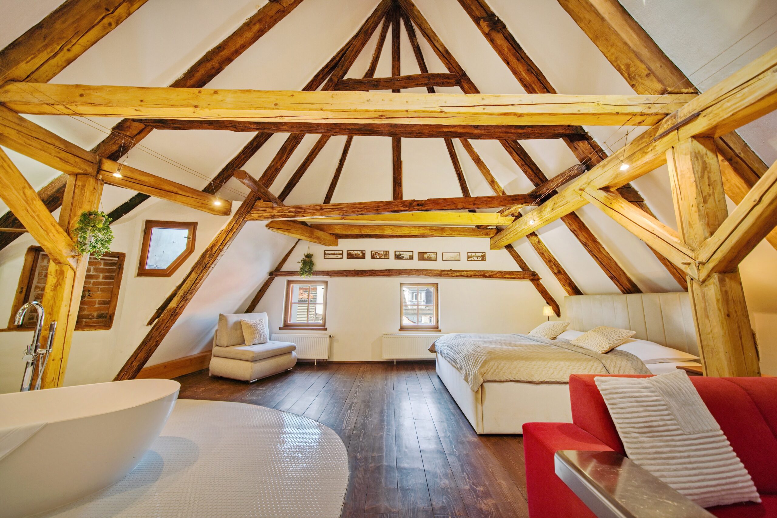Podkrovní apartmán s původními zrestaurovanými krovy nabízí komfortní ubytování pro až 4 osoby, ideální pro rodinu nebo přátele.