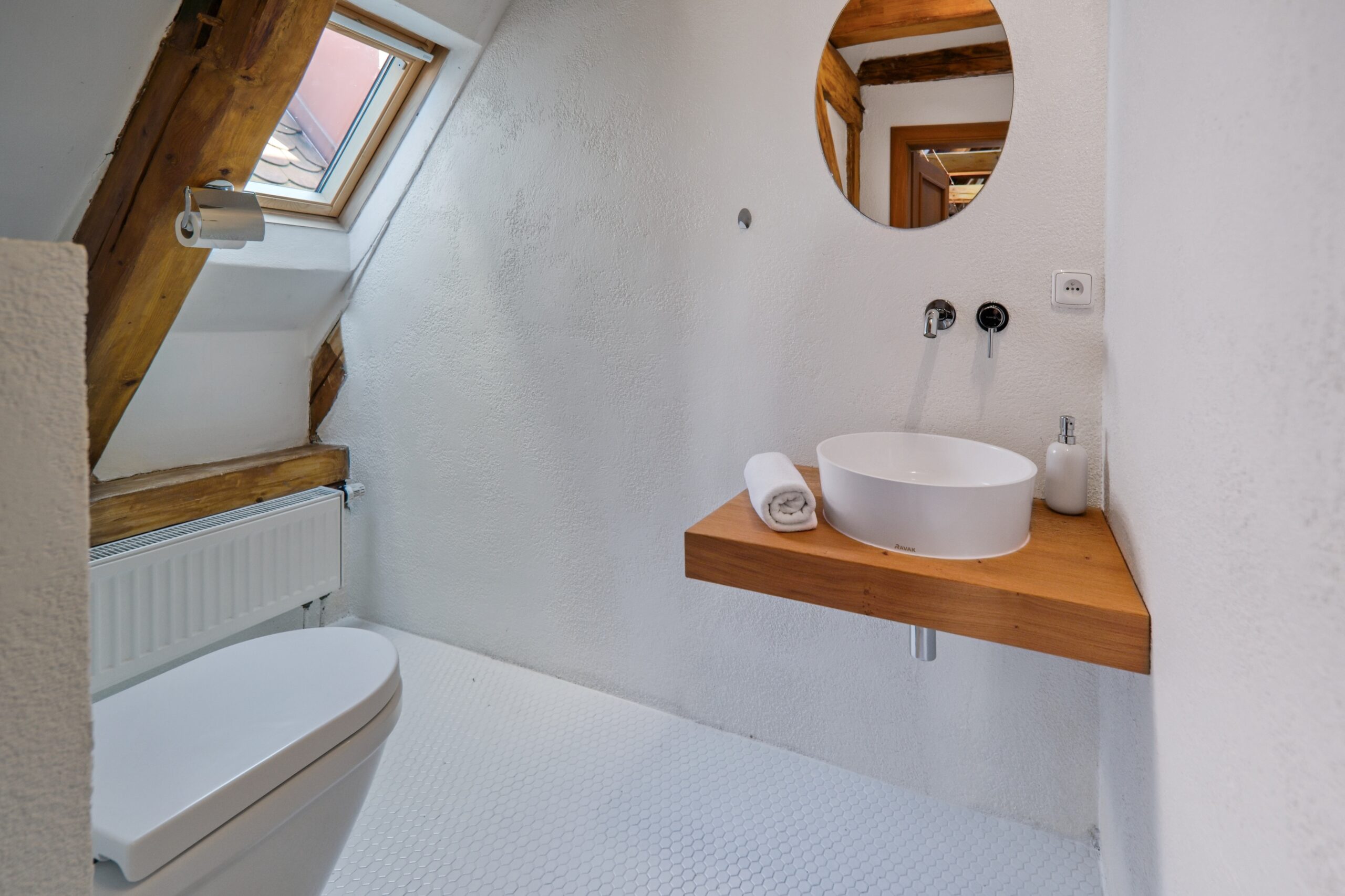 Jedním z hlavních lákadel apartmánu je volně stojící vana, která se nachází přímo v obytné části a vytváří nezaměnitelnou atmosféru klidu a romantiky. Je to místo, kde si můžete dopřát zasloužený relax při svíčkách nebo s výhledem na odkryté krovy. Pro ty, kteří dávají přednost rychlé očistě, je k dispozici také samostatná sprcha, která je součástí moderně řešené koupelny.